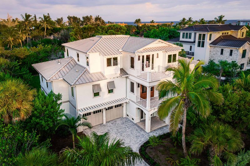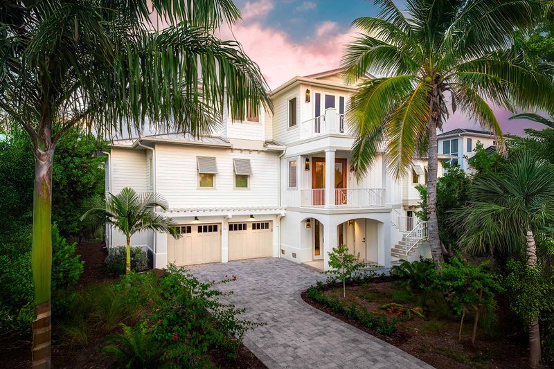 The coastal style design has great curb appeal with its use of mixed siding and mahogany bracket details and shutters. The prominent gable tops the third story balcony. The quaint cottage character is elevated with the metal standing seam roofs. While a white pergola perches over the 2-car garage. Enter the foyer and discover a 16-foot wall of sliding glass doors that open up the entire public space. The open floor plan gives the corner kitchen commanding attention to the dining area and great room. Perfect for indoor/outdoor entertaining. The gallery hall leads first to the laundry room tucked to the front of the house.